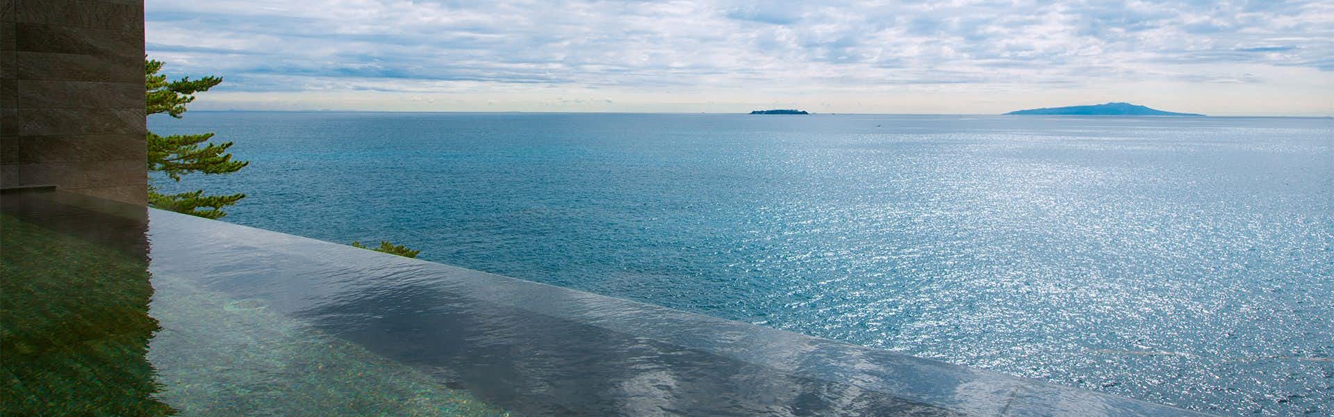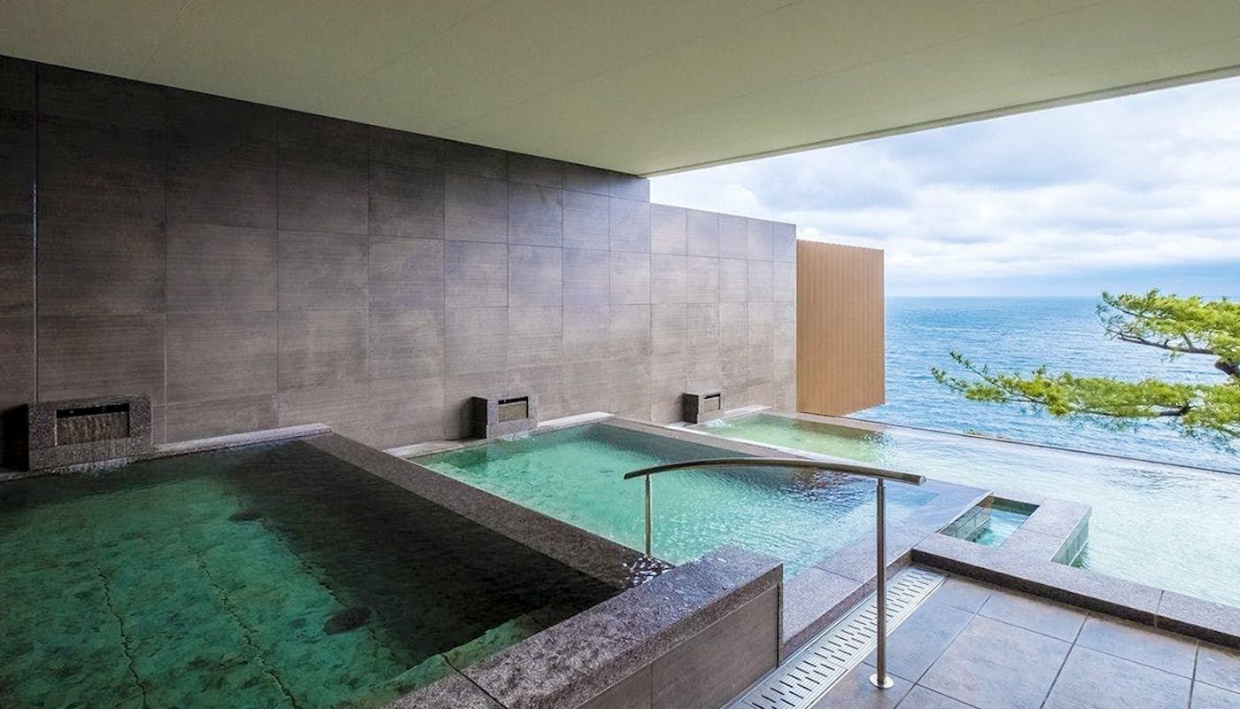 全室客室地下220mから汲み上げた自家源泉温泉付き。 テラスに露天風呂を備えたお部屋からは幻想的な表情を見せる海の景色を眺めることができます。熱海の海を背景に、5つのレストランとバーが仕切られることなく集まったシームレスなダイニングフロア。大浴場は、天空の船をイメージした全長12mのインフィニティバスドライ・スチームサウナ炭酸水・水素水の内風呂、湯上がりスペースも完備。また、熱海市内で初となるバトラーサービスも。お客様お一人おひとりに寄り添い、身の回りのお世話をするバトラーサービス。お好みの本のお届けから、大切な方への贈り物の調達までひとクラス上のサービスが、ご滞在をより豊かに彩ります。
