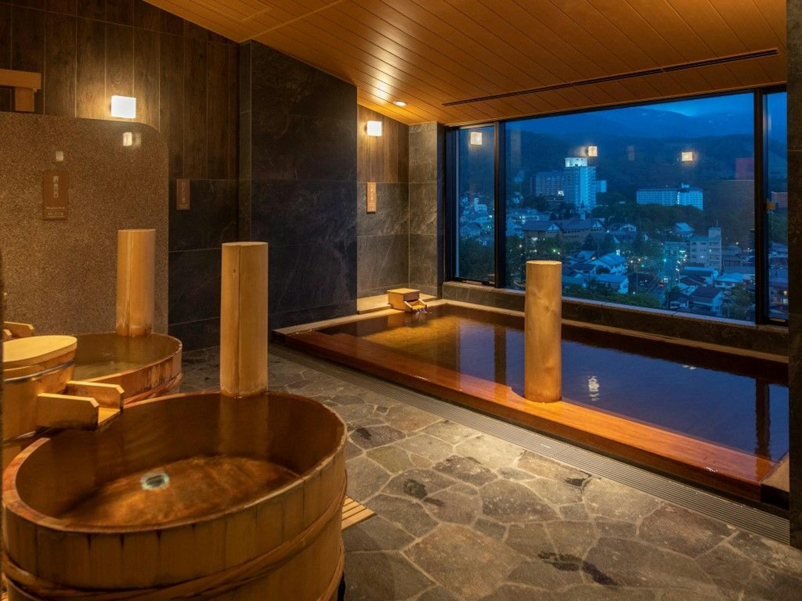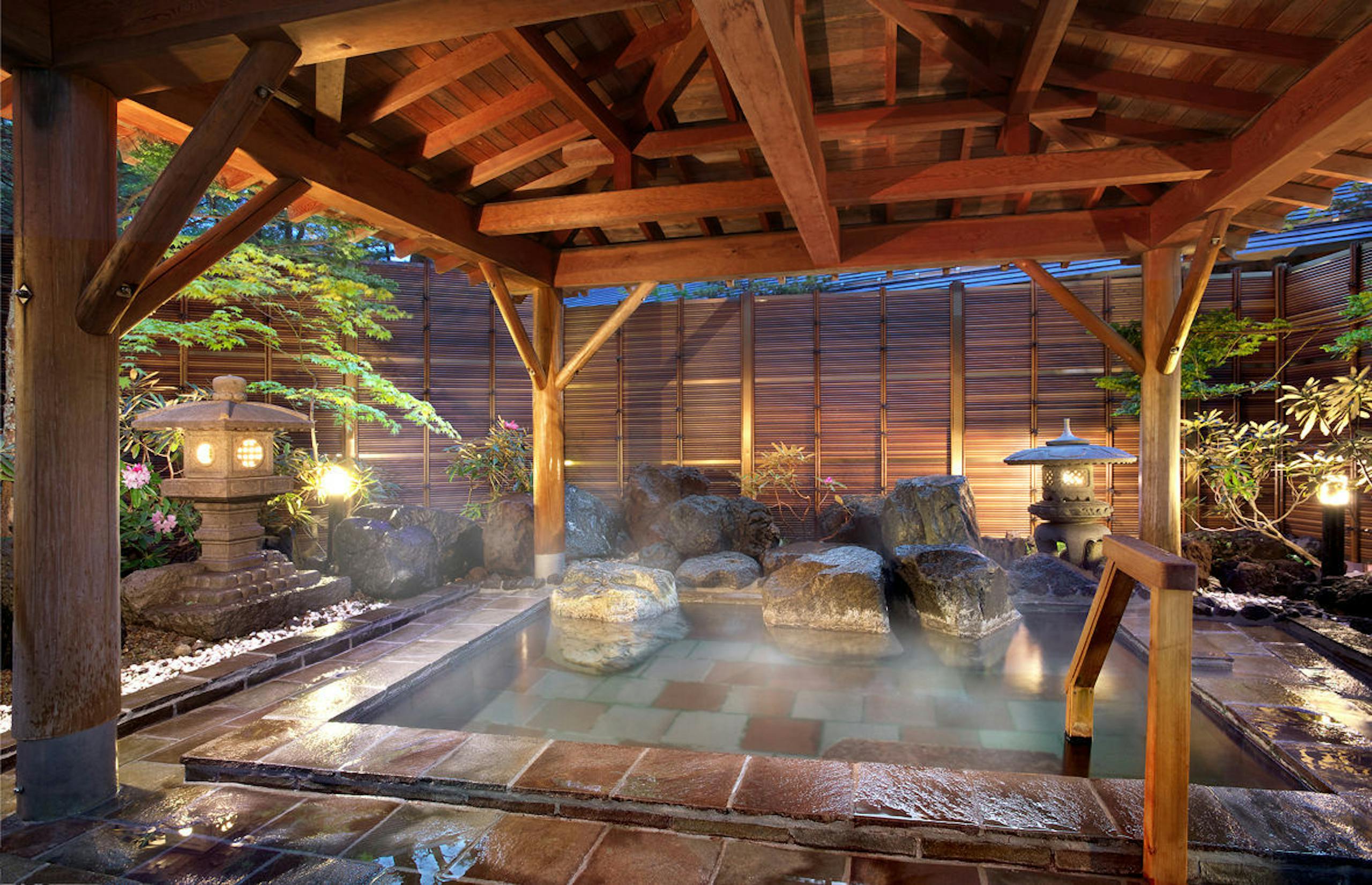 明治10年創業の老舗旅館。日本の伝統「湯守職人」が温泉を管理。天候や気候によって変化する湯船の温度を、毎日一定になるよう、丁寧に管理しています(入浴に最適な41℃~42℃に保つ)。また、お座敷の付いた三種類の貸切風呂もあります♨趣の異なる和モダンな客室には、マッサージチェアのあるお部屋も!!お食事は、季節によって献立を変えているので、旬の料理を味わうことができます。昼間はカフェ、夜は宿泊者専用のバーを併設しています。