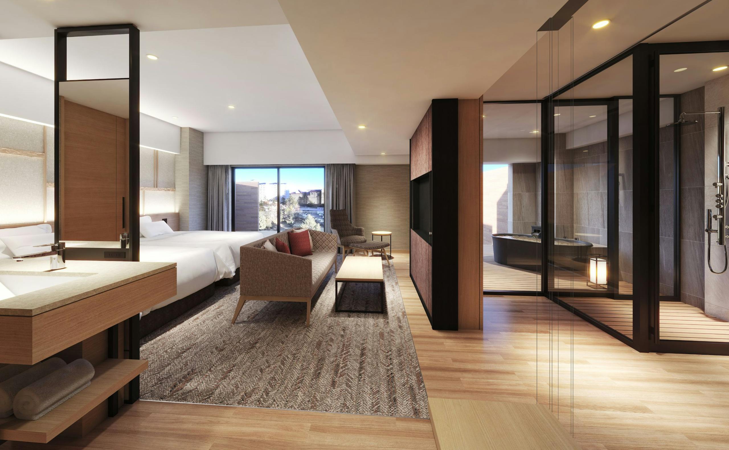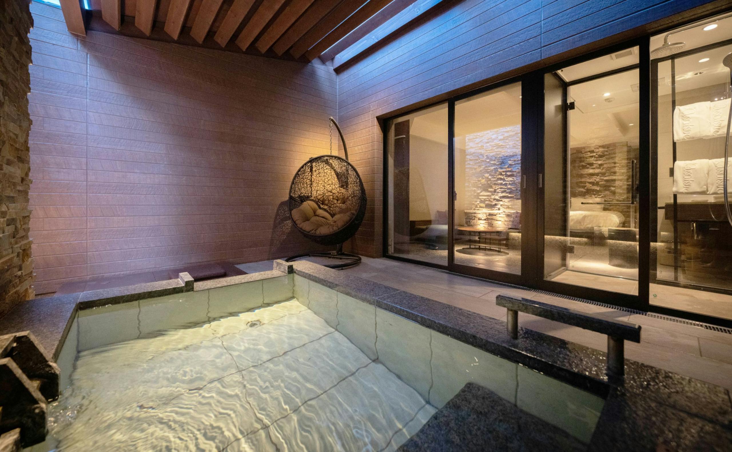 湯畑まで徒歩3分~5分。新たな新名所として生まれた裏草津の中心にオープン‼伝統的な日本の建築様式を取り入れた客室には、「半露天風呂付の地蔵温泉が楽しめるお部屋」とスタンダードルーム。温泉は、外庭と一体となった大浴場と、貸切風呂には、自然を浴びる屋上風呂、木を基調とした柔らかな雰囲気のお風呂、石を敷き詰めた落ち着きのあるお風呂の3種類計4か所あります。お食事は、「会席×炉端」。夕食は一皿ずつ舌鼓を打つコース形式、朝食は四季の彩りを詰め込んだ御膳を。そのほか、「暖炉とソファーのあるラウンジ」や、「バー」「テラス」「屋上バーラウンジ」があります。